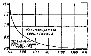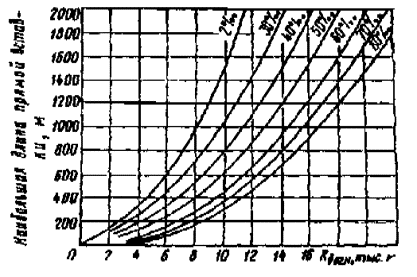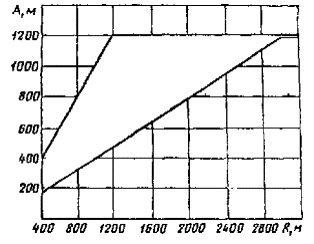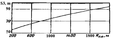 3.2.3. Расстояние от наблюдателя до экстремальной точки зависит от радиуса кривой в плане (или параметра переходной кривой) и положения наблюдателя на проезжей части и не зависит от продольного профиля. Это расстояние можно рассчитать по формулам 2 и 3 или определить по графику (рис. 3).