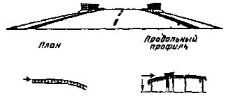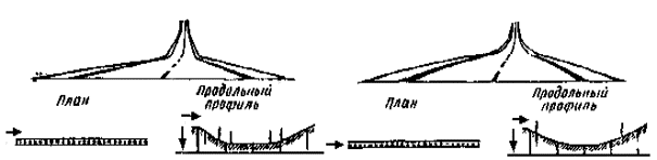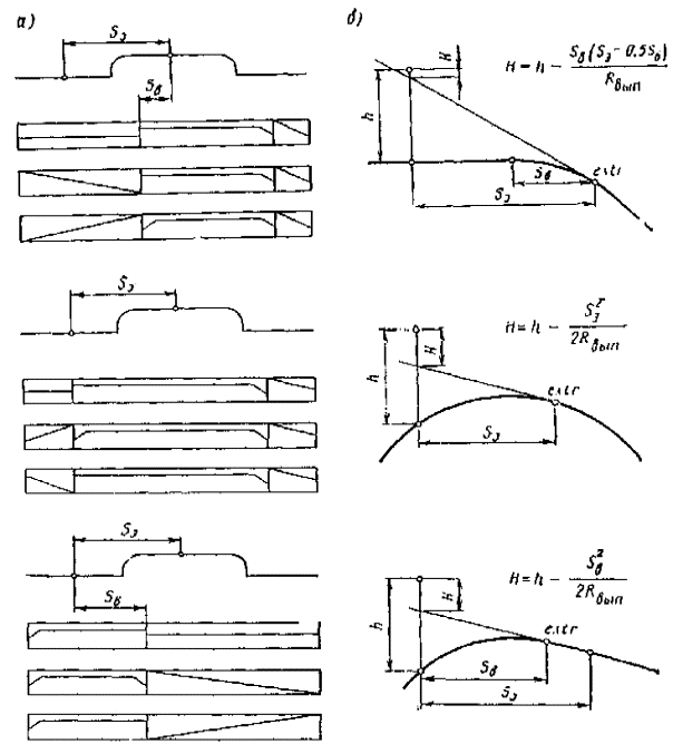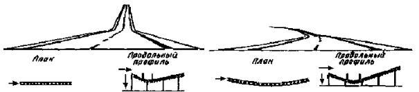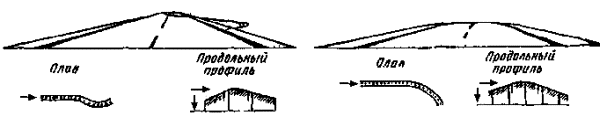 3.2.4. Высота глаз наблюдателя над поверхностью кривой (Н) зависит от расчетной высоты глаз водителя над проезжей частью (h) и продольного профиля на участке, где расположена кривая в плане. На выпуклом продольном профиле высота глаз над поверхностью закругления уменьшается и за счет этого увеличивается видимая кривизна ведущей линии, при вогнутом продольном профиле высота глаз над поверхностью закругления увеличивается, а видимая кривизна ведущей линии уменьшается. Величину Н определяют расчетом. Расчетную формулу выбирают в соответствии со схемой сочетания кривой в плане и кривой в продольном профиле на рис. 5 или 6. Величина Н не зависит от формы кривой в плане.