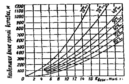 Рис. 3. Зависимость расстояния до экстремальной точки на кривой в плане от радиуса круговой кривой (при отсутствии переходной кривой)