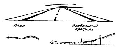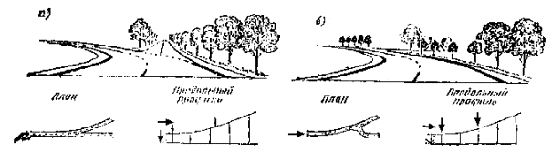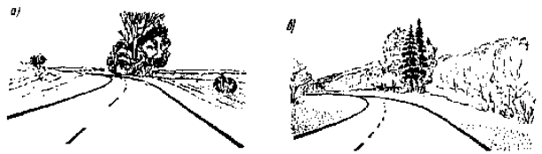 3.1.4. Субъективная оценка плавности одной и той же линии в зависимости от того, предъявляется она одна или в составе изображения дороги и фона, которым служит ландшафт окружающей местности, не одинакова: ведущая линия, воспринимаемая как плавная в составе изображения дороги, при одиночном предъявлении может вызвать ощущение резкой кривой. Зрительная плавность зависит не только от геометрических характеристик ведущей линии, но и дополнительных признаков. В этой связи следует оценивать плавность не одной какой-либо линии (например, трассы), а всей поверхности проезжей части дорогим говорить о плавности не трассы (одной линии), а всей дороги.