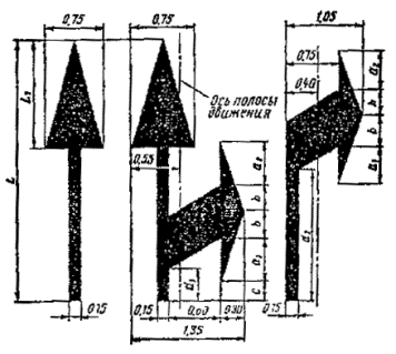 2.4.6. Для обозначения разрешенных на перекрестке направлений движения в сочетании со знаком 4.8 «Направления движения по полосам» или самостоятельно на полосах могут быть нанесены указательные стрелы 1.18 (рис. 2). Размеры стрел указаны в табл. 2.