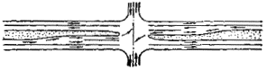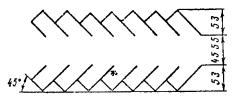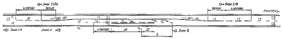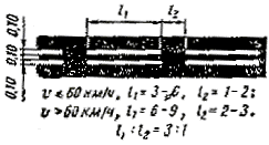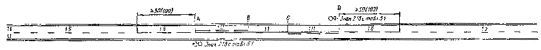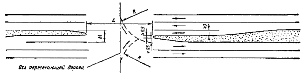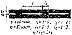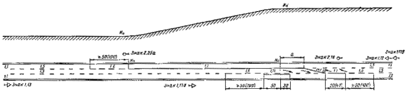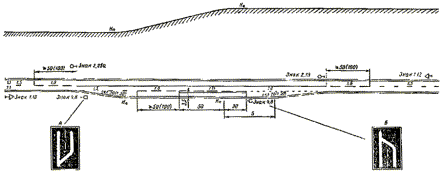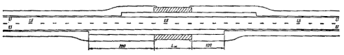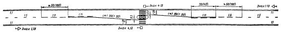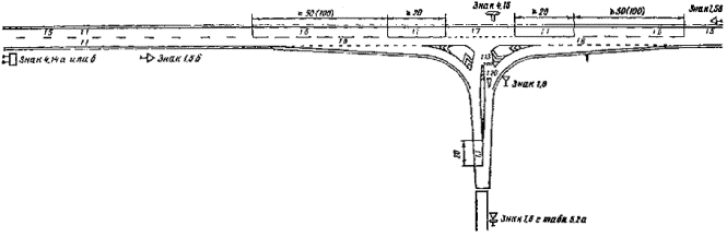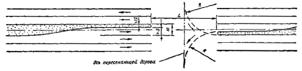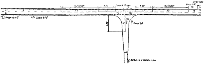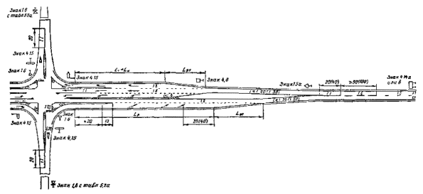 Наклонной переходной линии должна предшествовать сплошная линия, параллельная оси проезжей части, длина которой равняется 20 м при v £ 60 км/ч или 40 м при v > 60 км/ч.