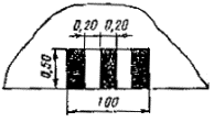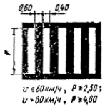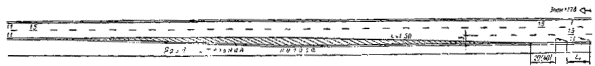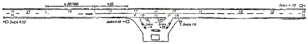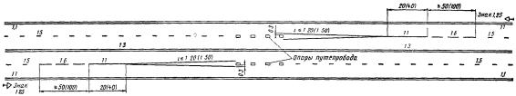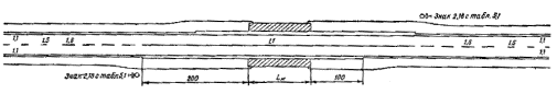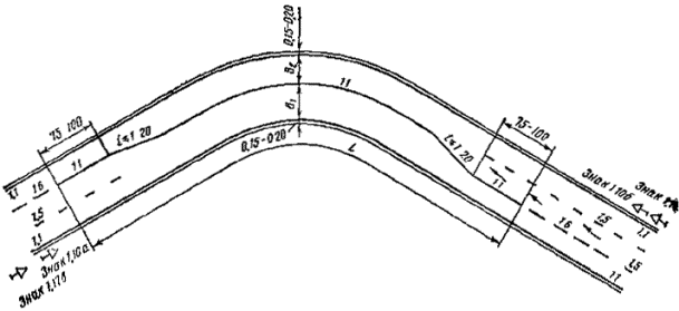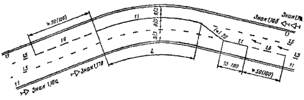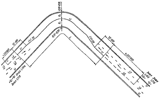 б) сплошной линией 1.1 на дорогах, имеющих две или три полосы для движения в обоих направлениях, перед железнодорожными переездами, в местах сужения проезжей части, на участках, где фактическая видимость меньше минимального расстояния видимости, обеспечивающего безопасность движения (табл. 1), а при необходимости перед перекрестками и в других опасных местах. Отдельные участки сплошной линии не должны быть менее 20 м. При изменении ширины проезжей части (перед препятствием, при уменьшении количества полос движения в данном направлении и т. д.) должна наноситься переходная линия 1.1, наклон которой не должен быть более 1/20 при v £ 60 км/ч и более 1/50 при v > 60 км/ч.