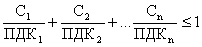 Ëèìèòèðóþùèé ïîêàçàòåëü âðåäíîñòè ó÷èòûâàåòñÿ ïðè îäíîâðåìåííîì ñîäåðæàíèè íåñêîëüêèõ âåùåñòâ â âîäå.  ñëó÷àå ïðèñóòñòâèÿ â âîäå íåñêîëüêèõ âåùåñòâ 1-2 êëàññîâ îïàñíîñòè ñóììà îòíîøåíèé ôàêòè÷åñêèõ êîíöåíòðàöèé êàæäîãî èç íèõ (C1, Ñ2. Ñn) ê èõ ÏÄÊ íå äîëæíà ïðåâûøàòü åäèíèöû: