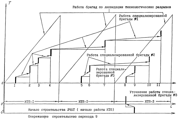 - определение оптимального числа специализированных бригад для строительства переходов в пределах сроков строительства всего МГ при обязательном обеспечении сплошности нитки газопровода на всех участках работы отдельных комплексных трубопроводостроительных потоков (КТП), исходя из основополагающего принципа организации строительства ЛЧМТ;
