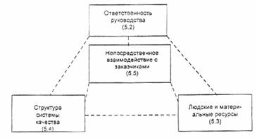 Рис. 2 показывает, что заказчик является центральным звеном трех ключевых аспектов системы качества. Он также показывает, что удовлетворенность заказчика может быть достигнута только при наличии гармонии между ответственным руководством, людскими и материальными ресурсами, а также структурой системы качества.