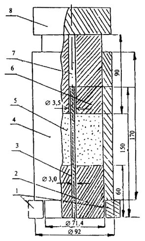 Прибор (рисунок 13) состоит из основания с подставкой 1 для образца 2, с отверстием 3, штанги 6 и направляющей втулки 8. Во втулке свободно перемещается штанга с навинченным на нее конусным наконечником 4.