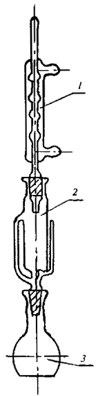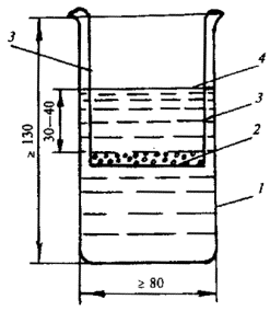 Сетку с навеской смеси опускают в стакан с кипящим раствором таким образом, чтобы уровень раствора 4 над смесью был не менее 30-40 мм, и укрепляют проволочными дужками 3 за край стакана.