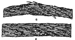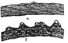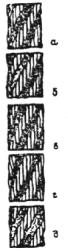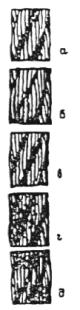 Рис. 4. Износ наружных проволок каната крестовой свивки: а - небольшие лыски на проволоках; б - увеличенная длина лысок на отдельных ппроволоках; в - удлинение лысок в отдельных проволоках при заметном уменьшении диаметра проволок; г - лыски на всех проволоках, уменьшение диаметра каната; д - интенсивный износ всех наружных проволок каната (уменьшение диаметра проволок на 40 %)