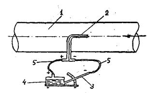 1 - воздуховод нагнетательный или всасывающий, 2 - пневмометрическая трубка, 3.- наклонная трубка микроманометра, 4 - резервуар микроманометра, 5 - резиновые шланги.