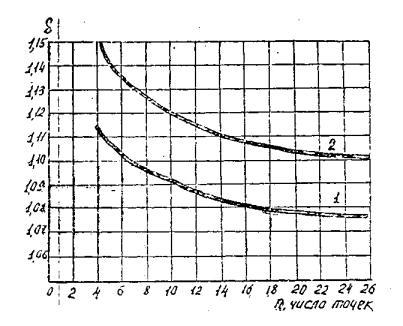 Рис. 2. График поправочных коэффициентов на величину расхода, воздуха по воздуховоду при измерении по методу равноотстоящих точек: