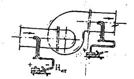 Рис. 5 Схемы присоединения пневмометрической трубки к микроманометру при определении напора, развиваемого вентилятором.