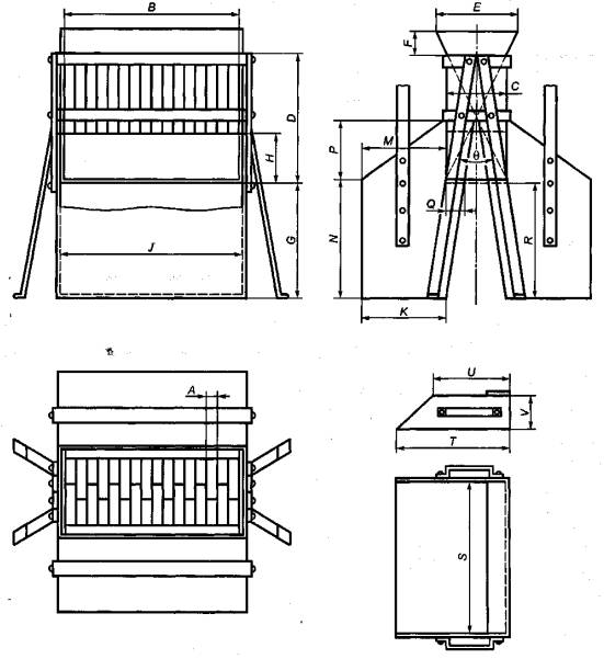 D.1 Размеры желобчатого делителя (рисунок D.1) приведены в таблице D.1.