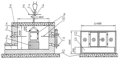 1 - дымовая труба; 2 - опора образца; 3 - кладка печи; 4 - огневая камера; 5 - перекрытие печи; 6 - защитный экран; 7 - подъемно-транспортное устройство; 8 - сбросное устройство; 9 - образец; 10 - термопары печные; 11 - форсунки; 12 - фундамент; 13 - защитное ограждение; 14 - гравийная подушка