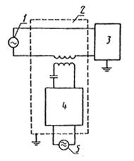 1 - источник питания; 2 - ИГ; 3 - ИТС; 4 - усилитель мощности гармоник; 5 - источник напряжения гармоник