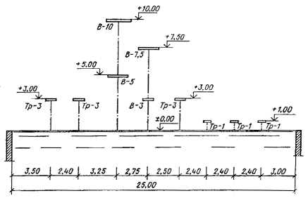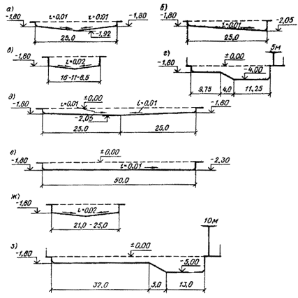 а – 25-метровая ванна для спортивного плавания с двухсторонним продольным уклоном; б - то же, с односторонним продольным уклоном; в - то же, с двухсторонним поперечным уклоном, г - 25-метровая универсальная ванна с вышкой для прыжков высотою 5 м; д - 50-метровая ванна для спортивного плавания с двухсторонним продольным уклоном, е - то же, с односторонним продольным уклоном; ж - то же, с двухсторонним поперечным уклоном; з - 50-метровая универсальная ванна с вышкой для прыжков высотою 10м