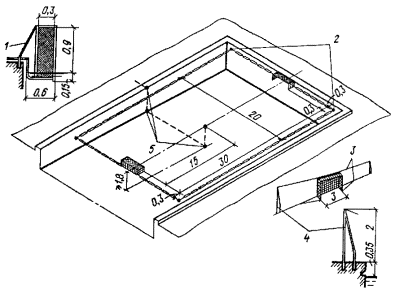 Допускается уменьшение размеров поля до 20´8 м и глубины - до 1 м. Пропускная способность поля 15 чел. в смену.