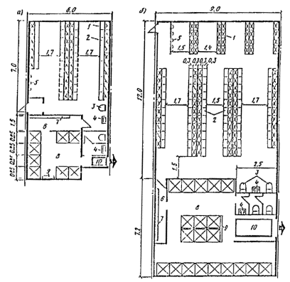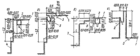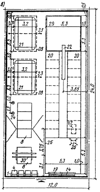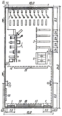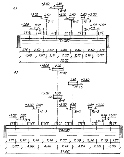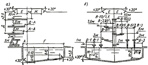 а - продольный разрез; б - поперечный разрез; (экспликация буквенных обозначений и наименование размеров даны в табл. 2)