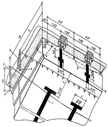 1 - крепление ворот к торцевой стенке; 2 - крюки для крепления плавучей разметки границ поля; 3 - троссы; 4 - крепление ворот к продольным стенкам; 5 - закладные устройства для опускания поплавка под мяч на дно