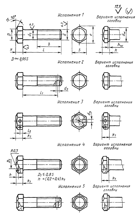 5б. Допускается для нанесения знаков маркировки изготавливать болты исполнений 1 и 2 с лункой на торцевой поверхности головки с размерами, не снижающими прочность головки, при этом глубина лунки должна быть не более 0,4 k.