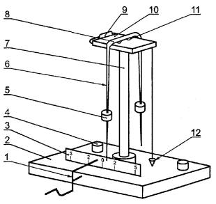 1 - пусковой механизм; 2 - основание; 3 - шкала; 4 - установочные винты; 5 - груз; 6 - двустрелочный механизм; 7 - штатив; 8 - соединительная планка; 9 - рамка; 10 - столик; 11 - стальные шарики; 12 - отвес