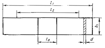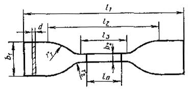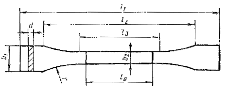 3.2. Толщину и ширину образцов измеряют в трех местах, в середине и на расстоянии 5 мм от меток. Из полученных значений вычисляют средние арифметические величины, по которым вычисляют начальное поперечное сечение А0.