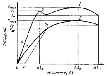 Определяют в тех случаях, когда испытуемый материал не имеет явного предела текучести; Sх определяют графически в точке: пересечения кривой «нагрузка - удлинение» с прямой, проведенной. параллельно прямолинейному начальному участку кривой «нагрузка-удлинение» и отсекающей от оси абсциссы участок удлинения, отвечающий относительному удлинению, величина которого должна быть указана в нормативно-технической документации на материал. Если в нормативно-технической документации на материал таких указаний нет, то значение этого» удлинения устанавливают таким, чтобы относительное удлинение составляло 1% (см. черт. 5, кривая 2) |