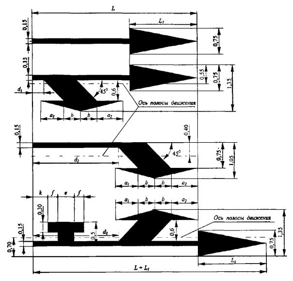 3.3 Номера, форма, цвет, размеры и назначение каждого типа разметки приведены в приложении А (таблицы А1 и А2). Размеры стрел, букв и цифр приведены в приложении Б (рисунки Б1 - Б9).