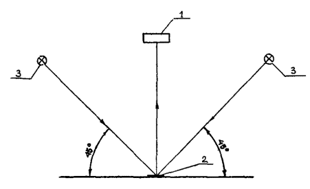 Г.1.2 Измерение проводят при геометрии 45°/0°, когда источник света 3 расположен под углом 45°, а фотоприемник измерительного прибора 1 перпендикулярно к поверхности 2 разметки (рисунок Г.1).