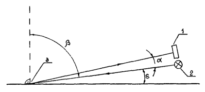 1 - фотоприемник, 2 - источник света, 3 - поверхность разметки b = 87,7°, a = 0,95°, e = 1,34°