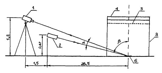 1 - яркомер, 2 - источник света, 3 - дождевальная установка, 4 - шланг, 5 - сетка, 6 - дорожная разметка (Расстояния в метрах)