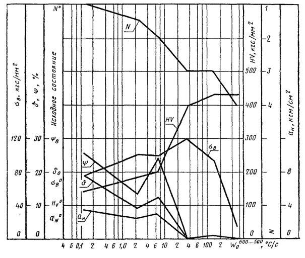 График зависимости временного сопротивления (σв), относительного удлинения после разрыва (δ), относительного сужения после разрыва (φ), твердости (НV), ударной вязкости (aн) и балла зерна (N0) при комнатной температуре от скорости охлаждения для стали 35