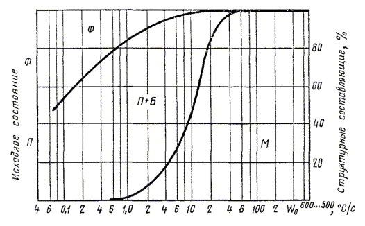 График зависимости процентного содержания структурных составляющих при комнатной температуре (Ф - феррит, П - перлит, Б - бейнит, М - мартенсит) от скорости охлаждения для стали 35