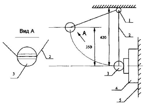 Латунный шар (3), подвешенный на нити (2), которая жёстко закреплена на горизонтальной штанге (1), поднимают на высоту (350 ±10) мм таким образом, чтобы нить маятника оставалась натянутой. После этого шар отпускают. Шар должен нанести удар по хрупкому элементу только один раз.