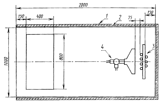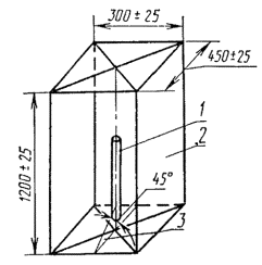 Испытательная камера длиной (450 ± 25) мм, шириной (300 ± 25) и высотой (1200 ± 25) мм без передней стенки. Все стенки камеры должны быть изготовлены из металла, а дно защищено слоем асбеста или другого теплозащитного материала (черт. 1).