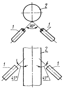 При испытании кабельных изделий с внешним диаметром до 50 мм включительно применяют одну горелку, диаметром св. 50 мм - две горелки.