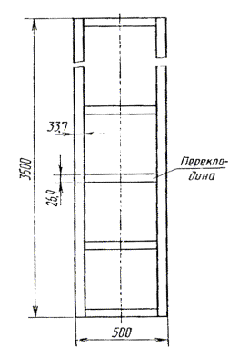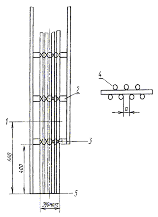 3.1.4. Каждый отрезок кабеля прикрепляют с помощью проволоки к перекладинам приставной стальной лестницы с числом перекладин, равным девяти (черт. 4). Общая ширина прикрепленных образцов кабеля должна быть не более 300 мм. Испытуемый образец должен располагаться по центру лестницы.