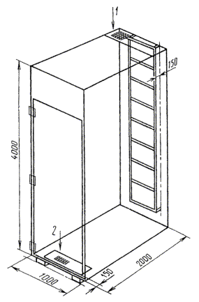 Стенки камеры должны быть выполнены из стальных листов толщиной 1,5 - 2,0 мм и иметь термоизоляцию толщиной не менее 65 мм с коэффициентом теплопередачи (0,7 ± 0,1) Вт/м2×°С (черт. 7).