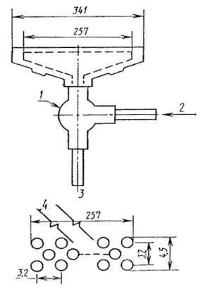 1 - смеситель типа Вентури для воздуха и газа; 2 - вход газа; 3 - вход сжатого воздуха; 4 - элементы горелки
