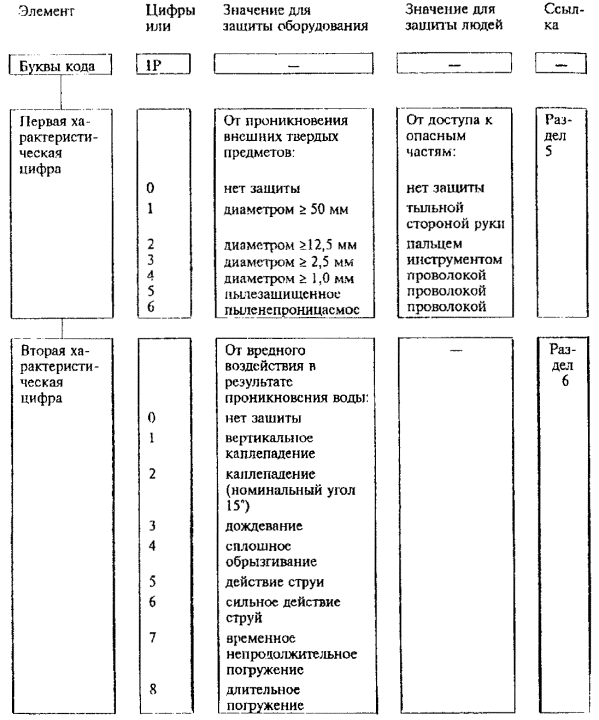 а) классификацию степеней защиты, обеспечиваемой оболочками, от проникновения твердых предметов (включая защиту людей от доступа к опасным частям изделий и защиту электрооборудования внутри оболочки от попадания посторонних твердых предметов) и от проникновения воды (защиту электрооборудования внутри оболочки от вредных воздействий в результате проникновения воды);