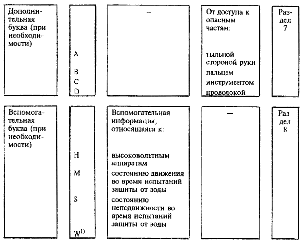 6) использование «дополнительных букв» для защиты от доступа к опасным частям с помощью ограждений (барьеров) или промежутков внутри оболочки, если это необходимо (см. раздел 7);