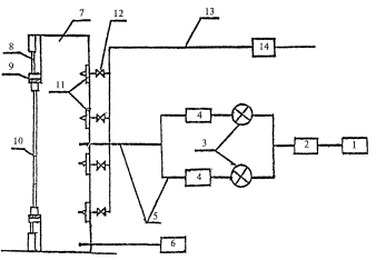 1 - компрессор (воздушный насос); 2 - регулятор расхода воздуха; 3 - воздушные запорные краны; 4 - ротаметры с различными пределами измерения; 5 - шланги; 6 - датчик давления (манометр); 7 - герметичная камера; 8 - приспособление для крепления образца; 9 - эластичные уплотнительные прокладки; 10 - образец. Дождевальное оборудование: 11 - форсунки; 12 - запорные устройства (вентили); 13 - шланг для подачи воды; 14 - счетчик воды