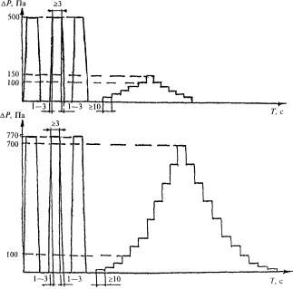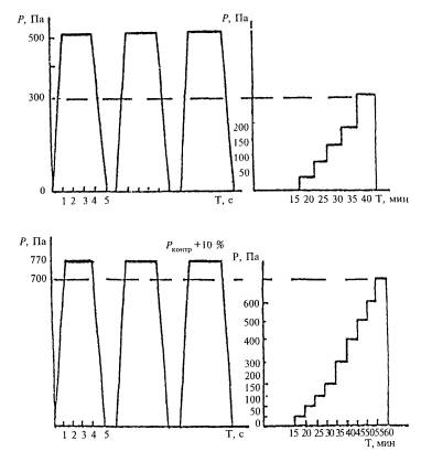 Продолжительность нарастания и снятия давления в каждом импульсе должна быть в пределах 1-3 с. Величину давления импульсов устанавливают на 10 % выше максимального давления, требуемого для испытаний, но не менее 500 Па, продолжительность воздействия - не менее 3 с (рисунок 2).