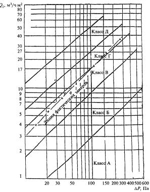Примечание - В тех случаях, когда линия фактических замеров, расположенная и поле какого-либо класса (например, класса В), на локальном участке заходит в поле низшего класса (например, класса Г), испытываемому образцу присваивают номер низшего класса воздухопроницаемости В случае, если воздухопроницаемость образца превышает границу класса Д, буквенное обозначение класса образцу не присваивают