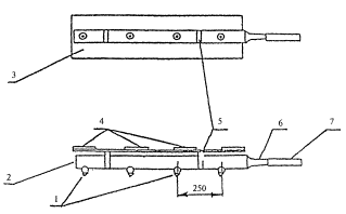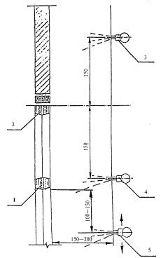 1 - образец, верхний брусок коробки; 2 - образец, горизонтальный импост; 3 - верхний неподвижный ряд форсунок; 4 - второй сверху неподвижный ряд форсунок; 5 - дополнительный ряд форсунок