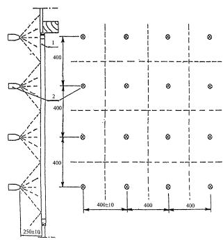 При испытании по схеме № 2 распылительные форсунки располагают квадратно-гнездовым способом с ячейкой [(400´400) ± 10]мм. Распылительный факел каждой форсунки должен несколько перекрывать площадь орошения смежных форсунок.