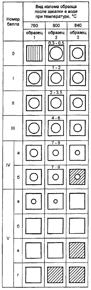 2 Балл прокаливаемости устанавливается по глубине прокаливаемости в миллиметрах, указанной над изломами образцов, закаленных от температуры 800 °С.