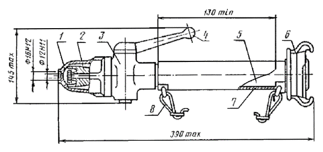 1 - стакан; 2 - вкладыш; 3 - перекрывающее устройство; 4 - ручка; 5 - корпус ствола; 6 - соединительная головка ГМ-50 по ГОСТ 2217-76; 7 - термоизолирующий чехол; 8 - ремень