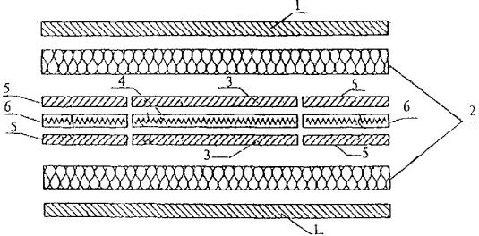 1 - холодильник; 2 - испытываемые образцы; 3 - плиты нагревателя зоны измерения; 4 - обмотка нагревателя зоны измерения; 5 - плиты нагревателя охранной зоны; 6 - обмотка нагревателя охранной зоны