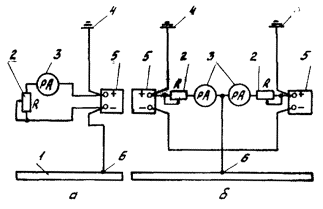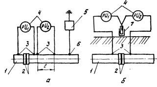 Рис. 34. Схемы включения измерительных приборов и устройств при опробовании и наладке изолирующих фланцев трубопровода: